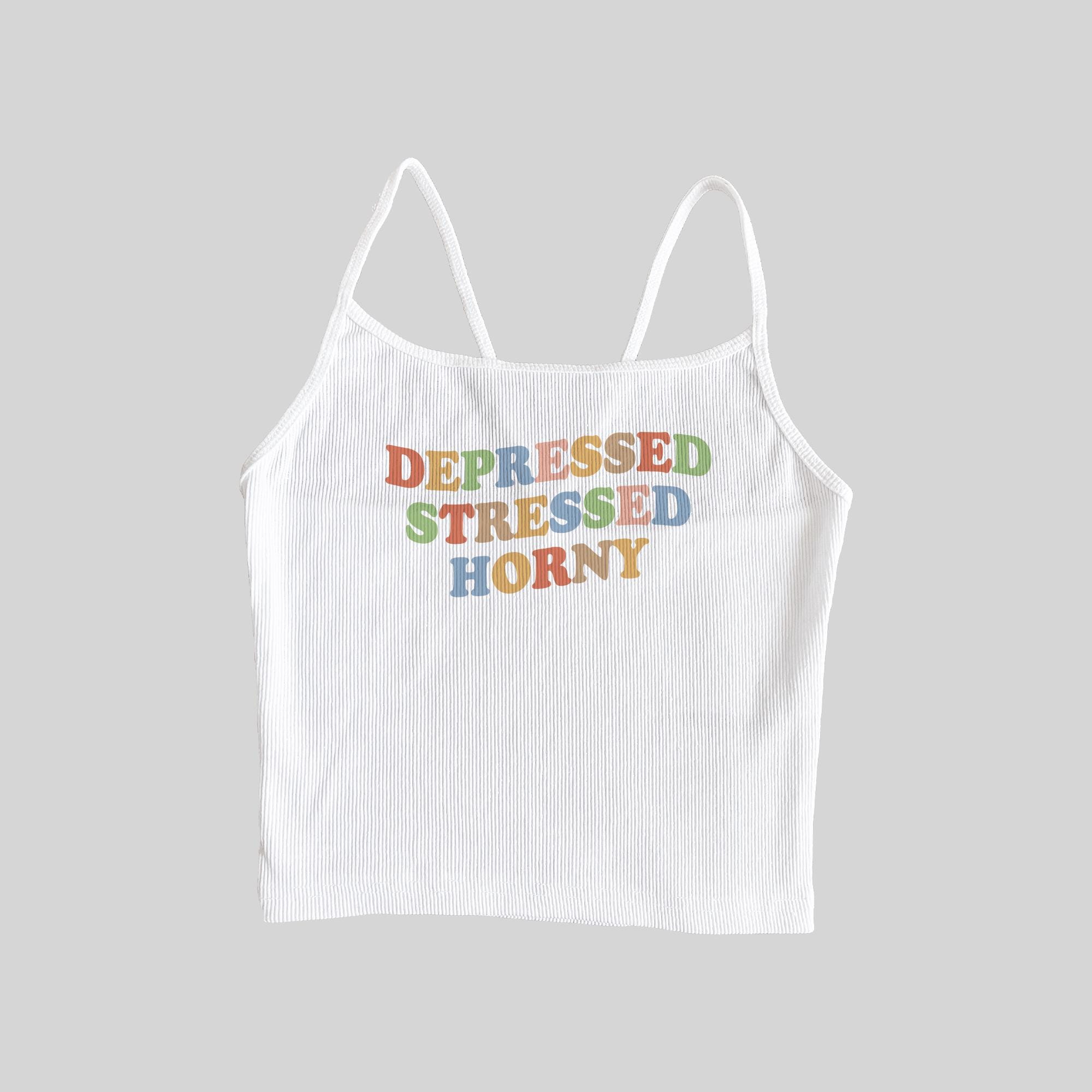 Depressed Stressed Horny Ribbed Spaghetti Strap Crop Top
